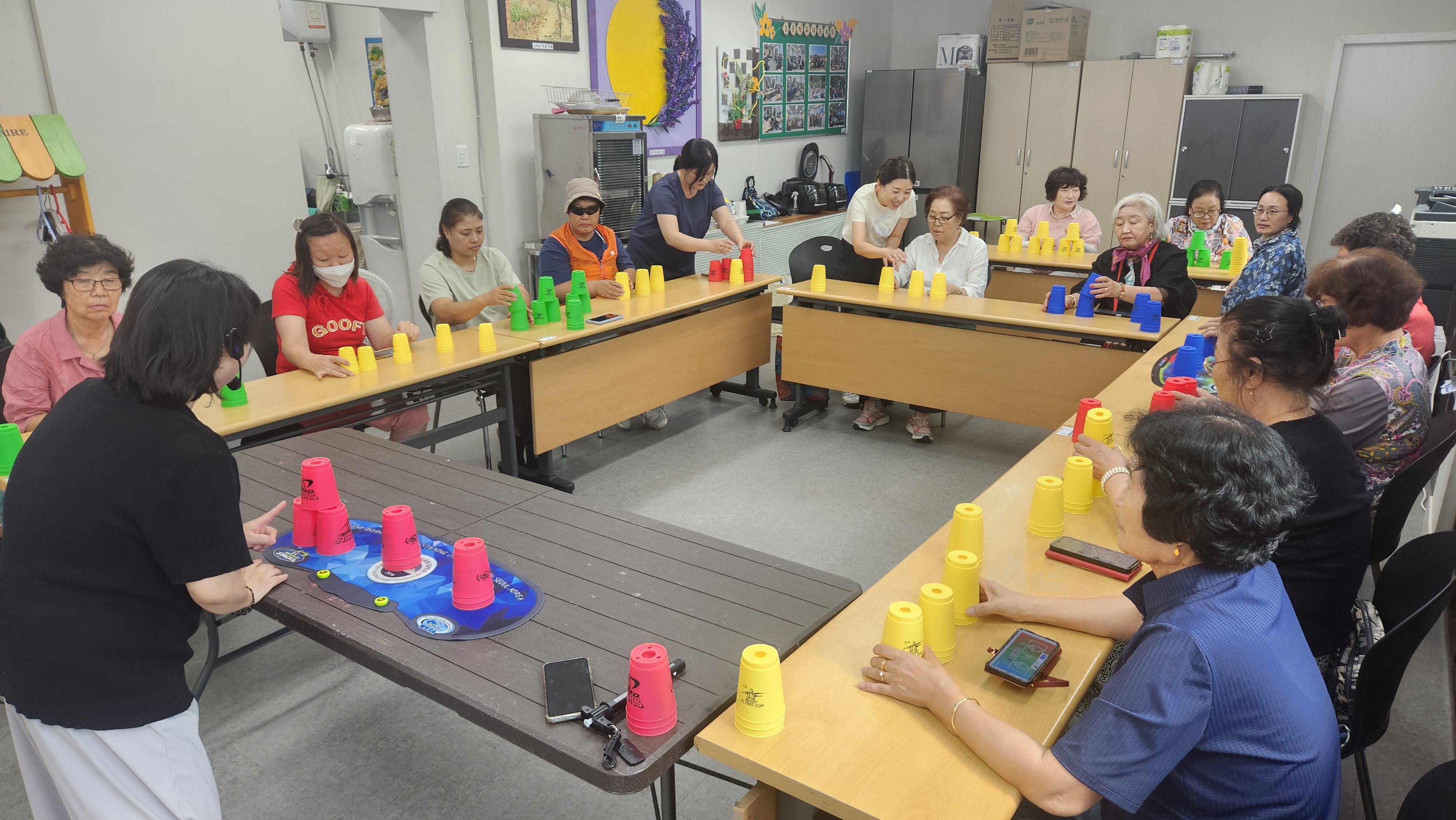 오늘은 1반과 함께 컵타/스포츠스태킹을 해봅니다. 손스팟으로 손을 좌우로 흔들고 위아래로 흔들고 한팔은 좌우 한팔은 위아래로 섞어 흔들어 보았습니다. 멋진인생 노래에 맞춰 기본컵타 동작으로 컵타를 해보았으며 3.3.3 스태킹을 기록을 재보면서 내 기록을 확인해보는 시간을 가져보았습니다. 기록재는 기계가 없는 분들을 위해서 플레이스토어에서 "스피드큐브타이머" 어플을 깔아보고 폰으로도 충분히 기록을 잴수있다는 것을 알아봅니다. 각자 3.3.3 스태킹 하는 시간을 가져본 후 마무리체조로 오늘이 젊은날 노래에 맞춰 신나게 율동을 해봅니다. 항상 밝은 에너지가 넘쳐나는 컵타시간, 모두들 행복한 웃음으로 하루를 마무리해보았습니다. 즐거운 컵타/스포츠스태킹 시간이었습니다.