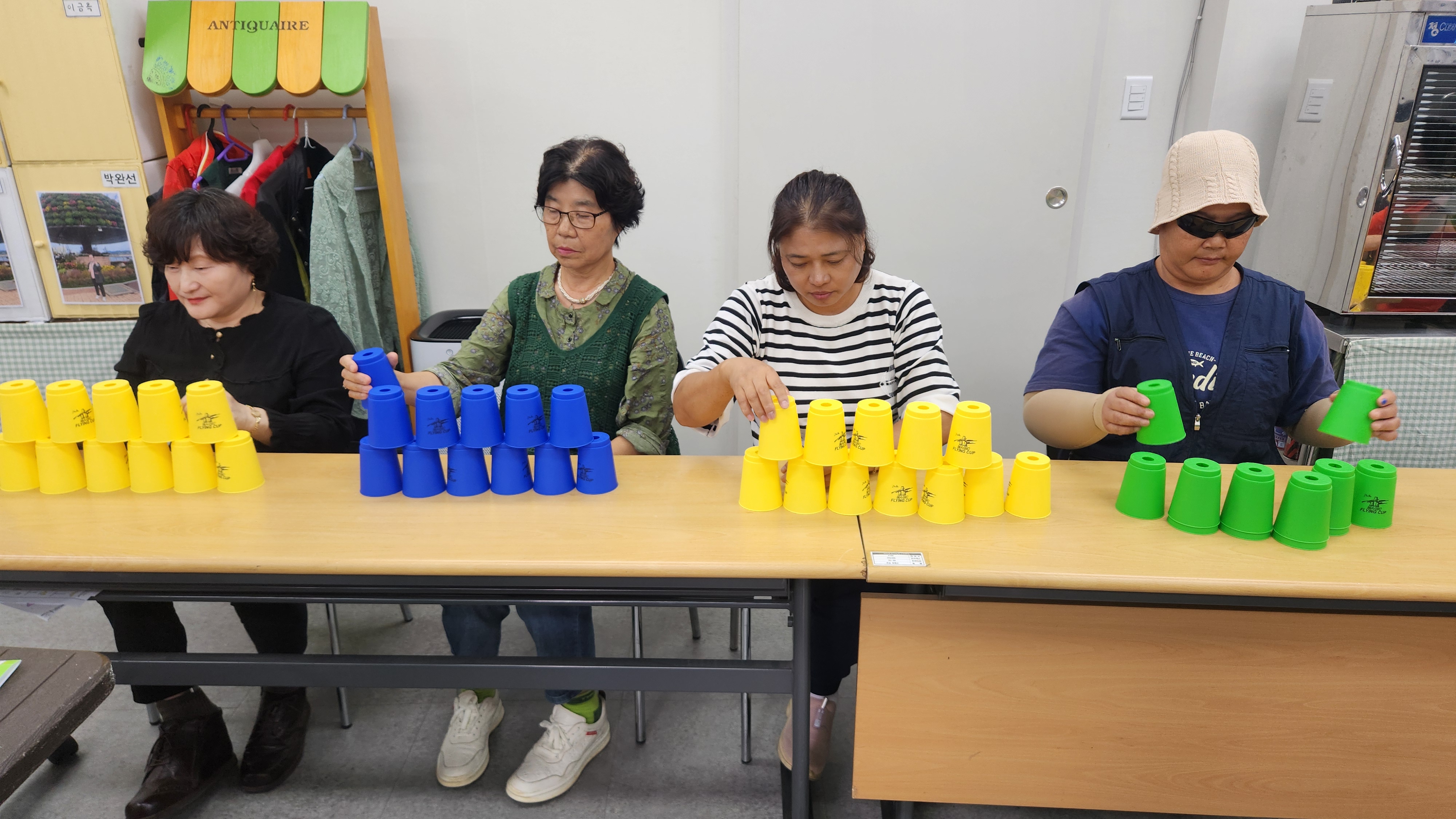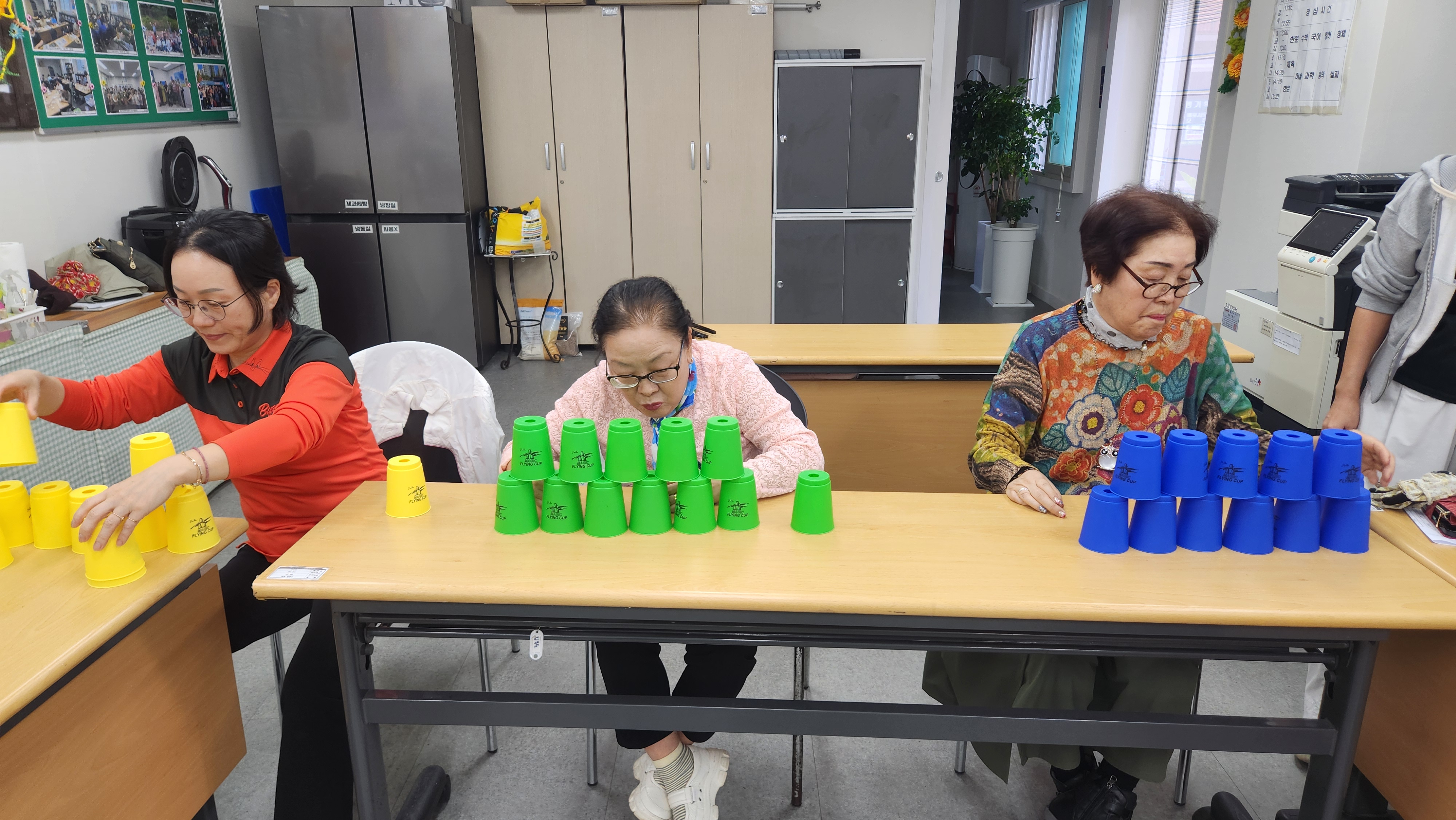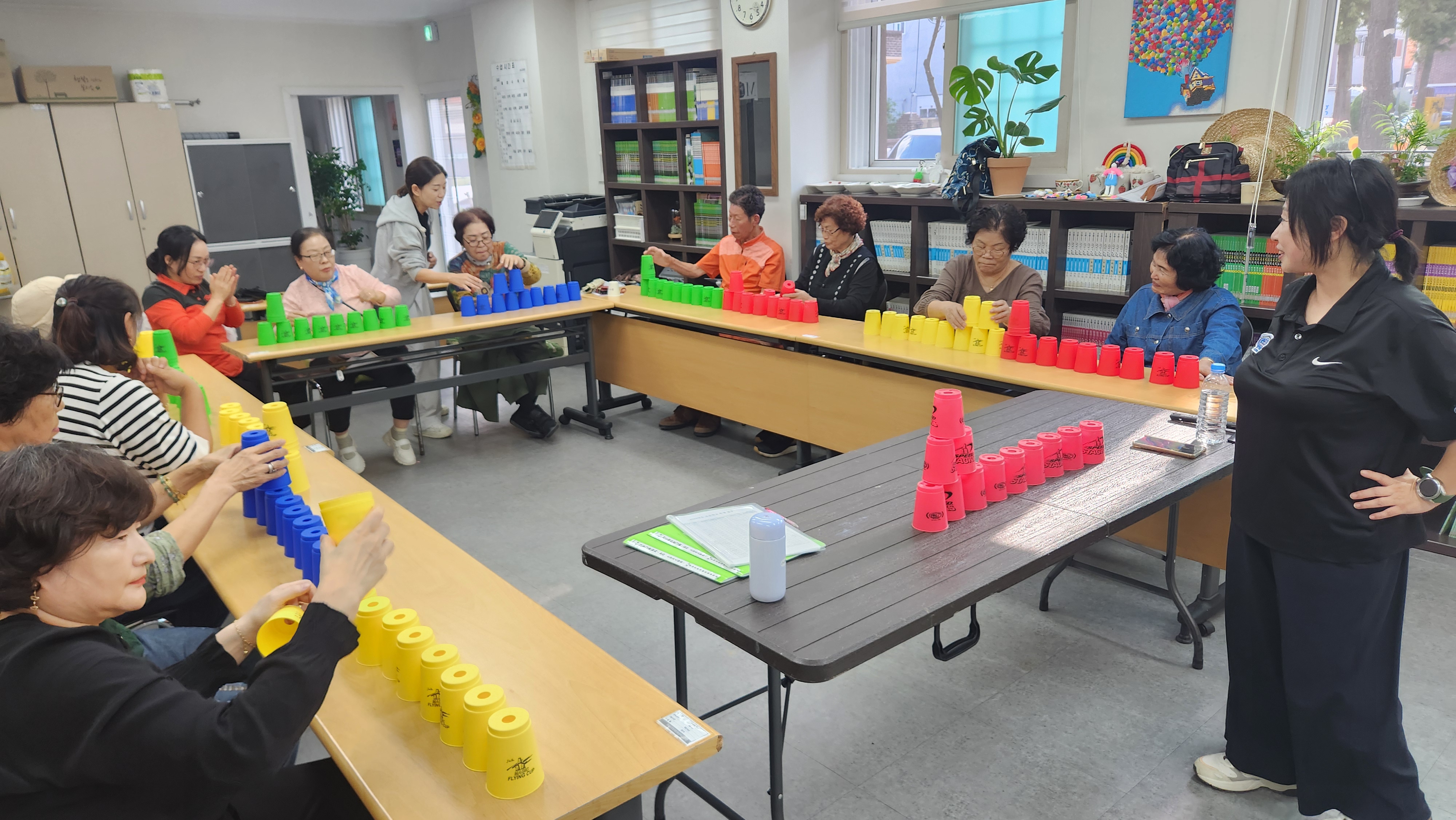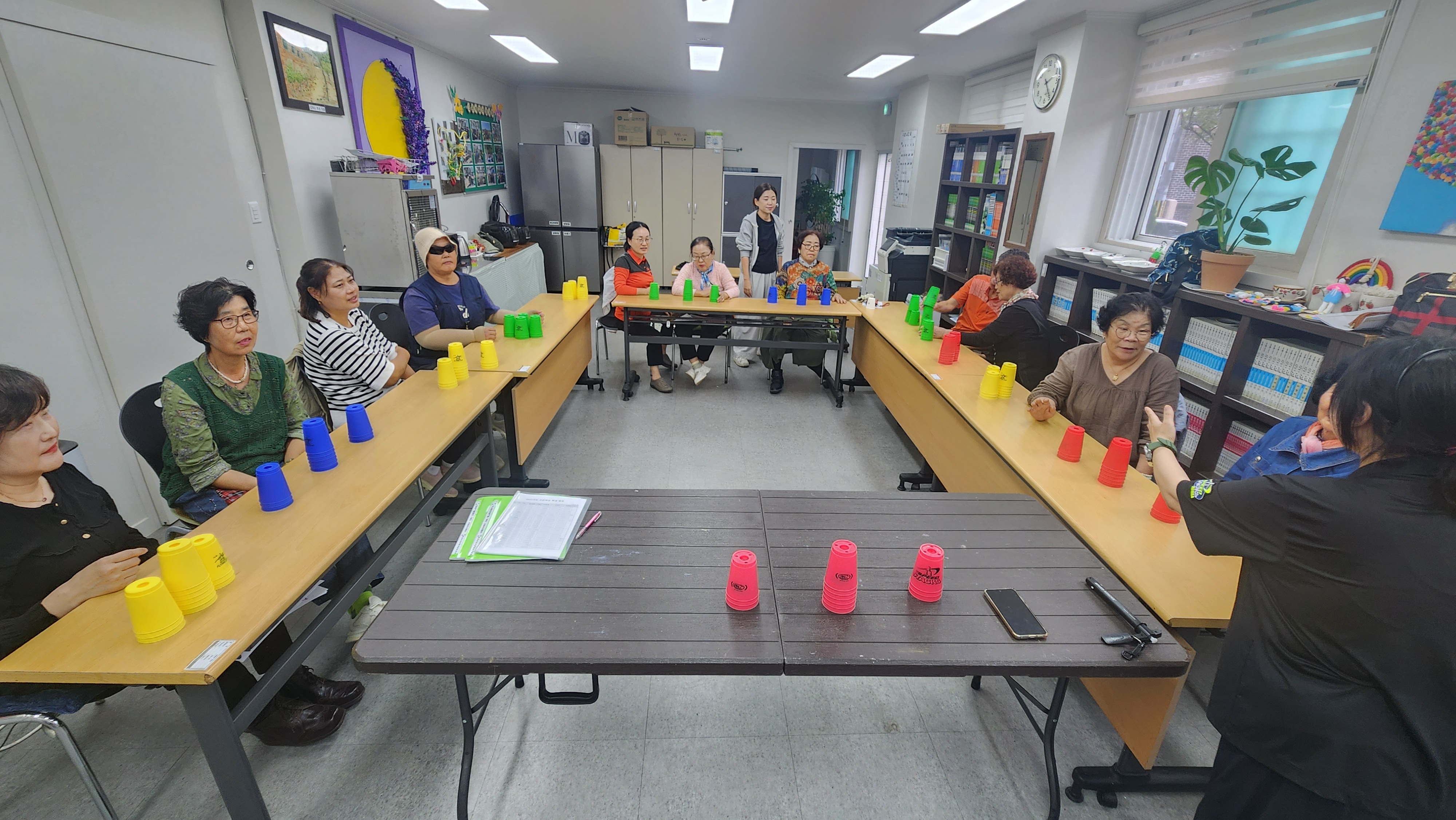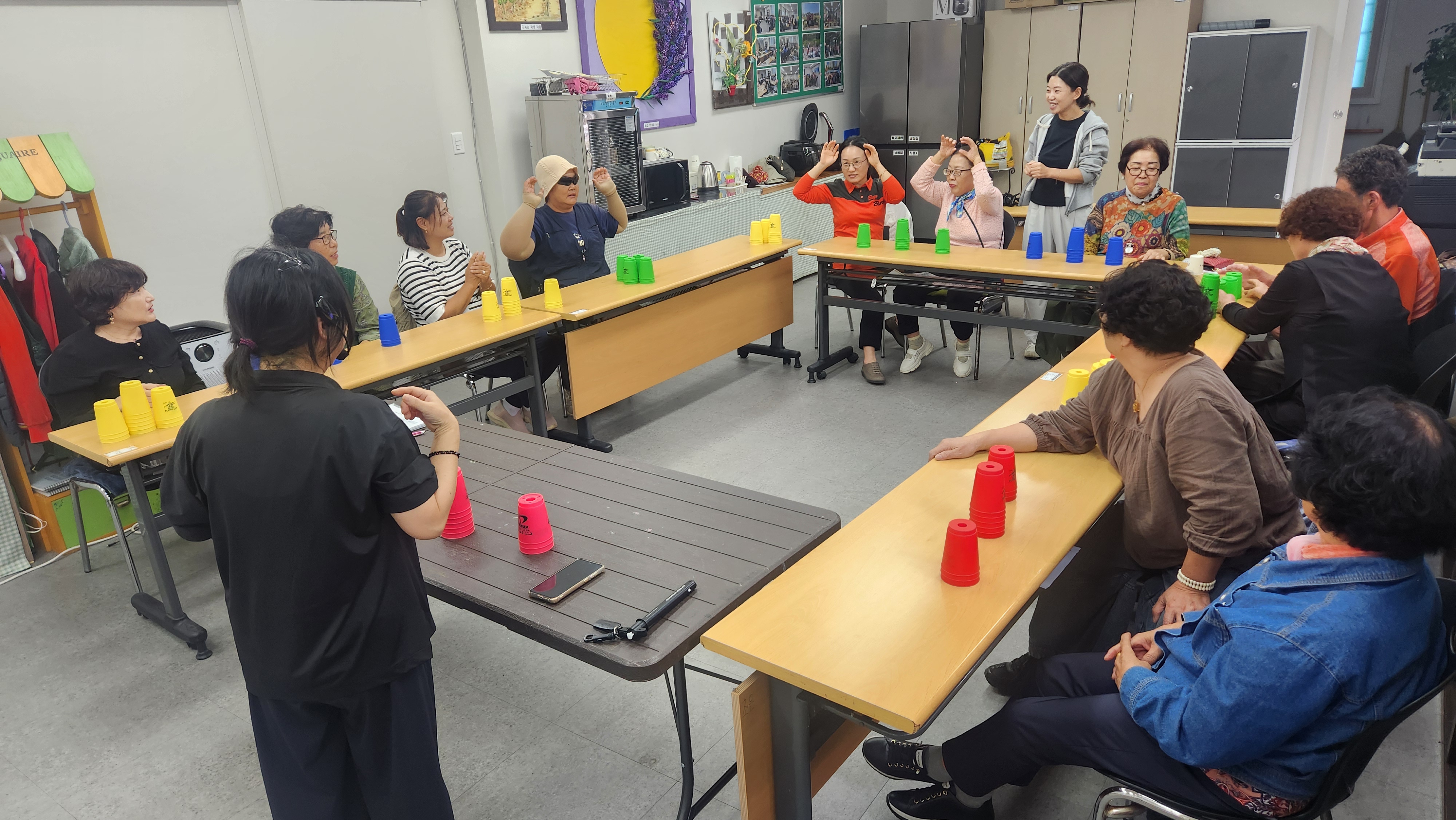 오늘 1반과 함께 한 프로그램은 컵타/스포츠스태킹으로 묵찌빠를 이용해 다양한 손스팟을 해보았으며 홍시 노래에 맞춰 컵타를 해봅니다. 홍시 박자가 생각보다 빨라 컵타하는데 따라가다가 웃음이 터진 우리 학생들~ 항상 컵타는 재밌고 즐겁게 하시네요. 이번에는 3.6.3 스태킹에서 업그레이드 하여 옆사람과 한몸이 되어 더블경기를 해봅니다. 한사람은 오른손, 한사람은 왼손을 사용하여 한몸으로 3.6.3 스태킹을 해보았는데 처음에는 어려워하고 해깔려하시는 분들도 계속된 연습끝에 훨씬 자연스럽게 컵을 쌓아올릴수 있었습니다. 마무리체조로 보약같은 친구 노래에 맞춰 가사에 맞게 율동을 하며 마무리해봅니다. 즐거운 컵타시간이었습니다.