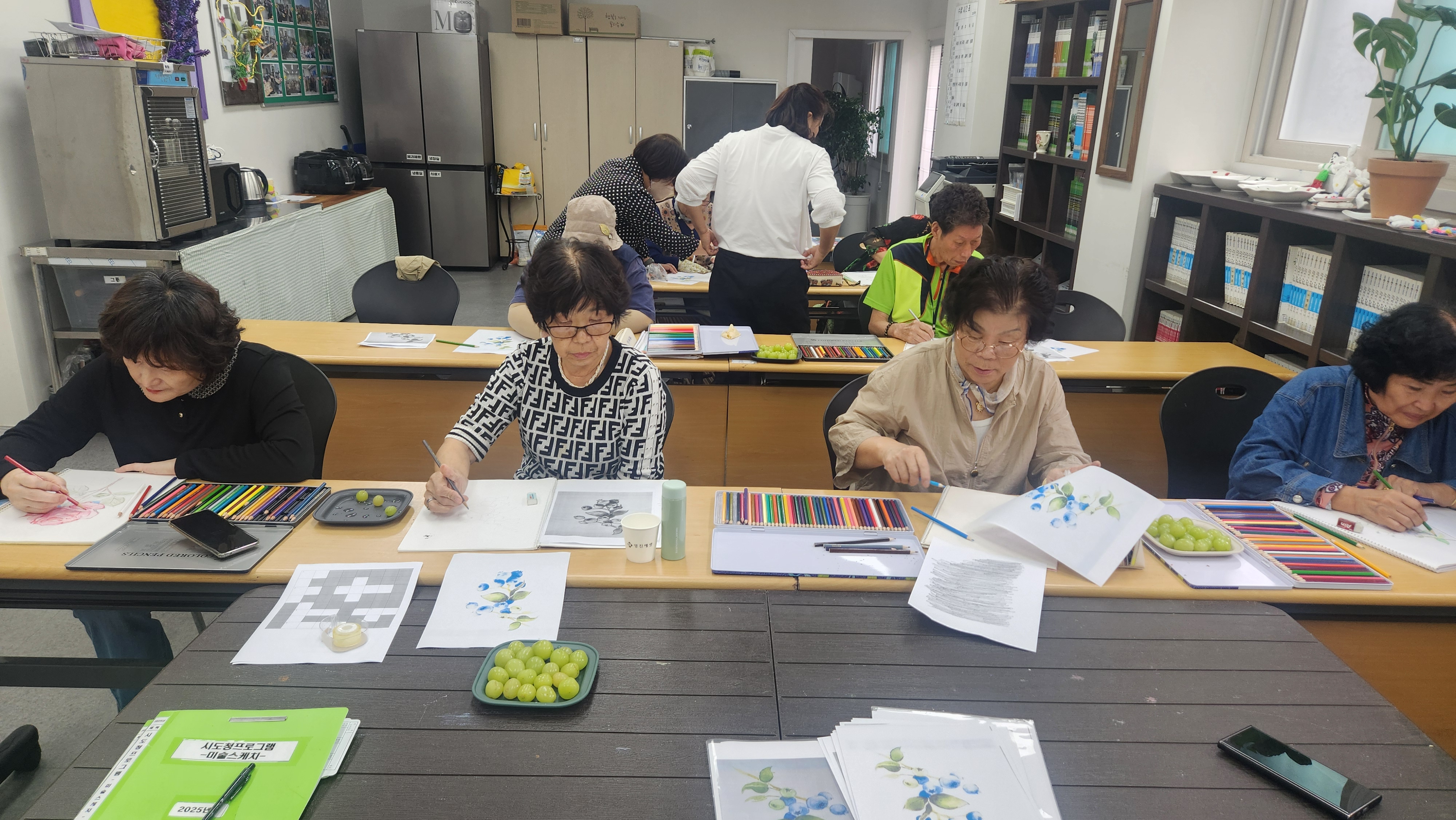 오늘 1반과 함께 한 프로그램은 미술스케치로 지난주에 이어 블루베리 스케치를 마무리해봅니다. 먹지에 대고 선을 따라 그린 후 뒤에 새겨진 선을 따라 연한회색 색연필로 그려봅니다. 지우개로 연필자국은 지우고 연한 회색 윤곽선을 따라 색을 입혀봅니다. 연한색부터 깔아주고 점점 진한색으로 색칠해보며 명암도 표현해봅니다. 아직 1반은 색칠하는것이 처음이라 서툴긴 하지만 색칠하면서 다들 본인 스스로의 작품에 만족하시는 모습이 보기가 좋습니다. 즐거운 스케치 시간이었습니다.