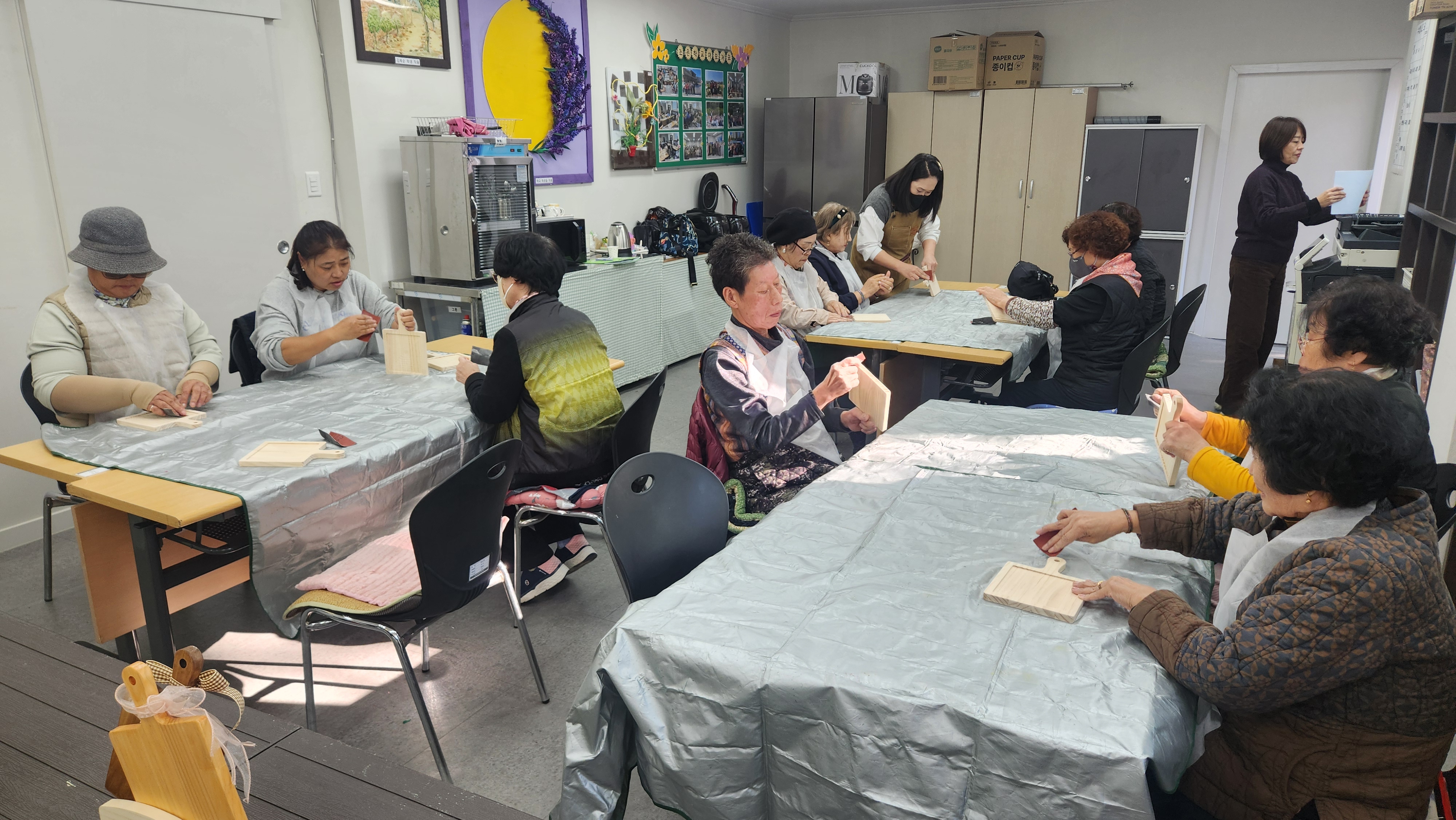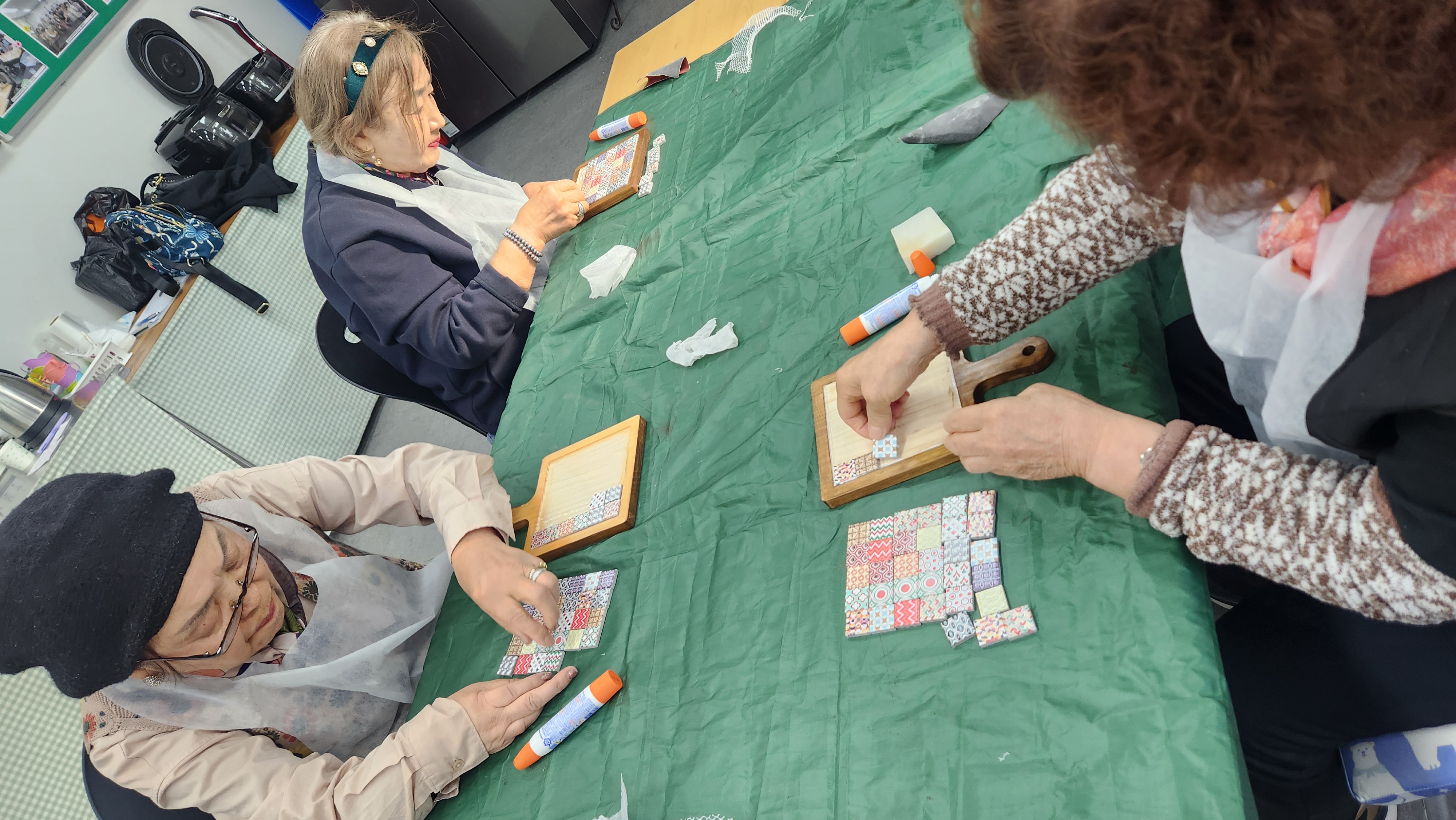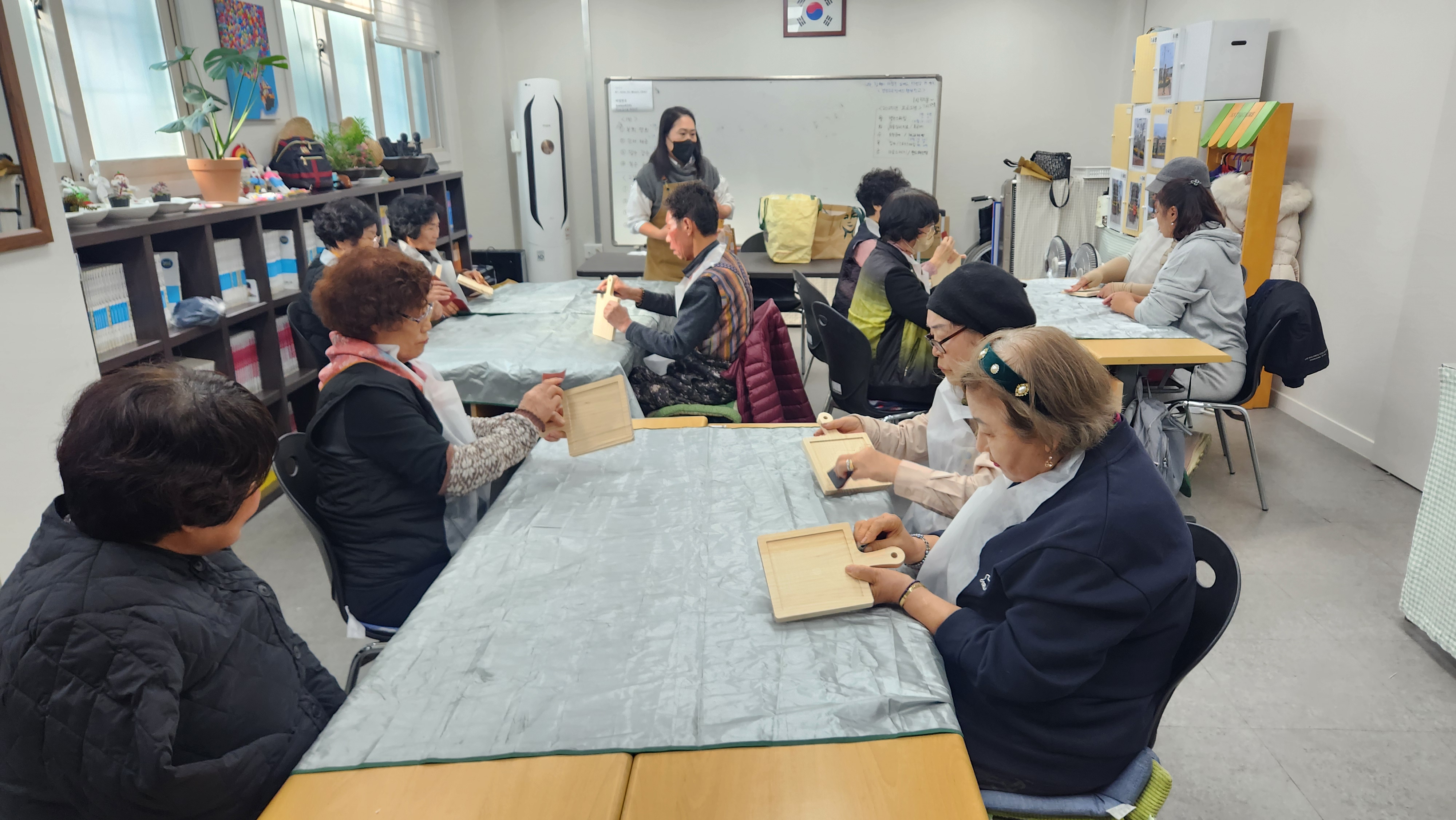 오늘 1반과 함께 한 프로그램은 목공예로 우드를 이용하여 냄비받침을 만들어보았습니다. 먼저 손잡이가 달린 나무판을 사포로 부드럽게 갈아주었습니다. 부들부들해진 나무판 위에 스폰지로 연한색 또는 진한색을 입혀줍니다. 그런다음 크림으로 코팅을 해주었습니다. 타일을 하나씩 뜯어보고 그 위에 목공예 풀을 이용하여 하나씩 타일을 붙혀서 완성시켜주었습니다. 완성하고 보니 너무나 실용적인 냄비받침이 완성되었네요. 재밌고 유익한 시간이었습니다.