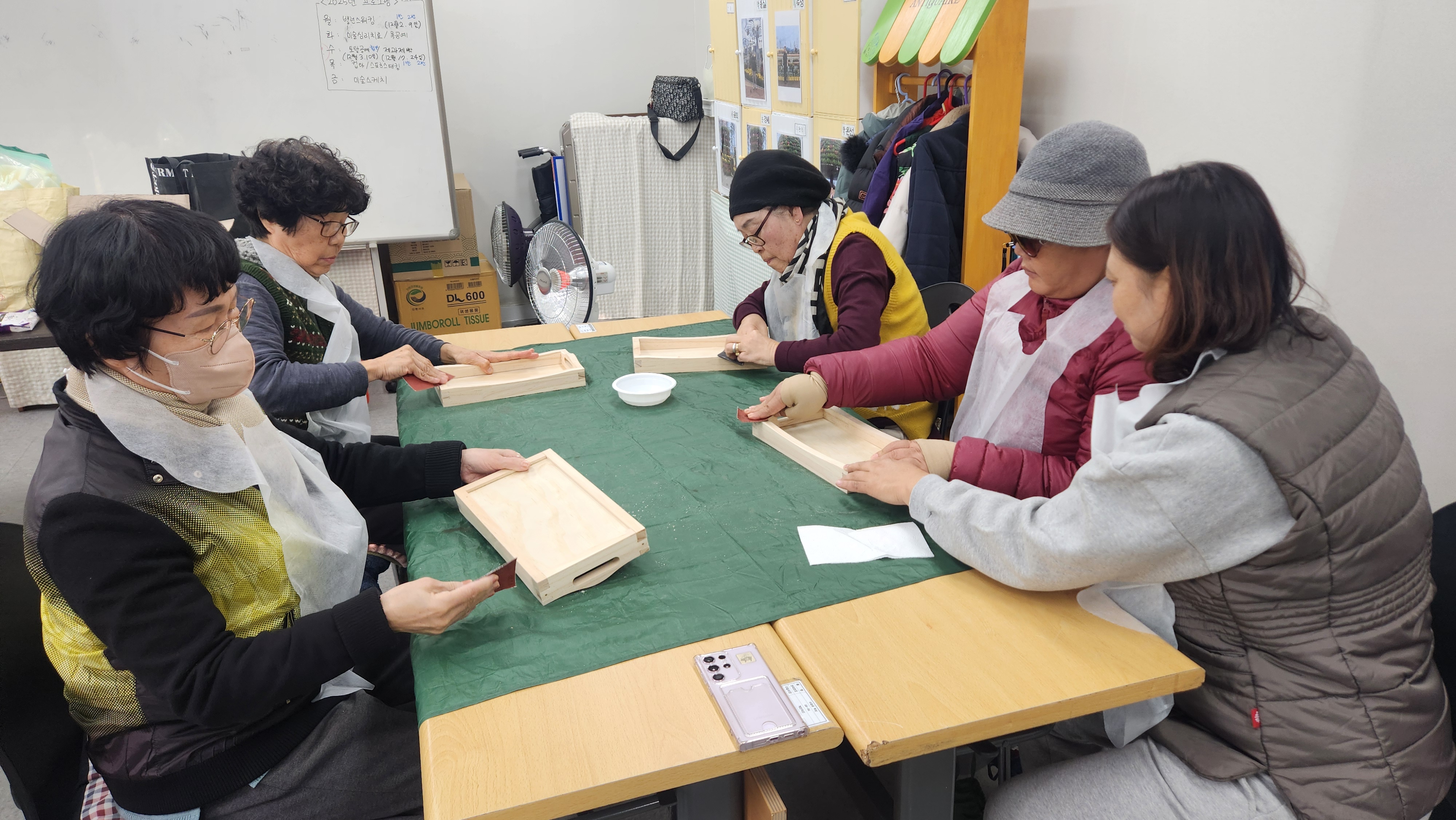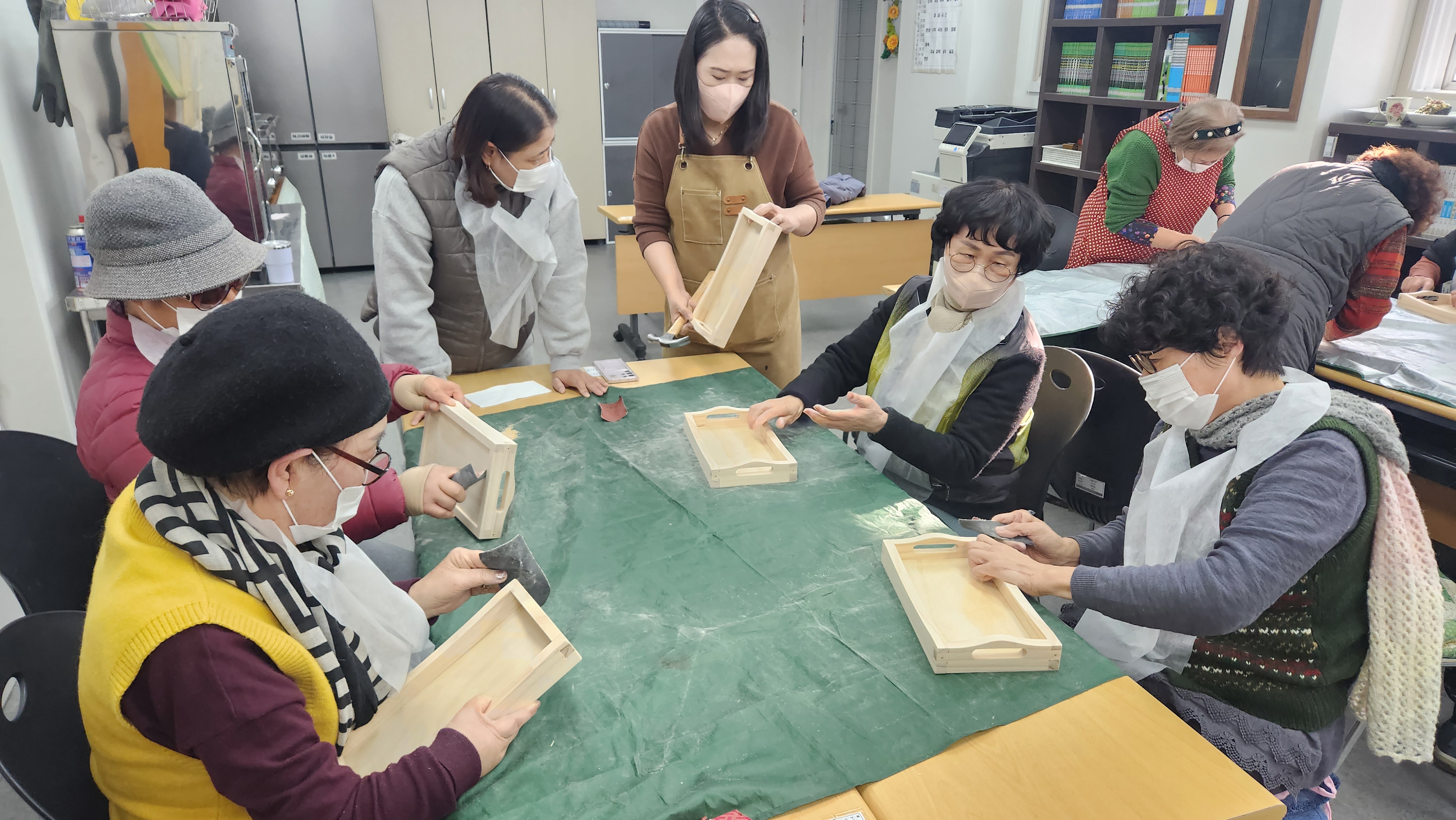 오늘 1반과 함께 한 프로그램은 목공예로 우드 트레이를 만들어보았습니다. 먼저 나무조각을 겹쳐 트레이 형태로 고정시켜줍니다. 그런다음 못으로 고정을 하고 사포로 부드럽게 갈아주었습니다. 그 위에 원하는 색을 여러번 펴발라주었습니다. 그런다음 모양틀에 물감을 찍어 이쁘게 장식해보고 마무리로 바니실로 코팅해주었습니다. 모두들 개성있는 트레이를 완성시켜보았습니다. 즐거운 목공예시간이었습니다.