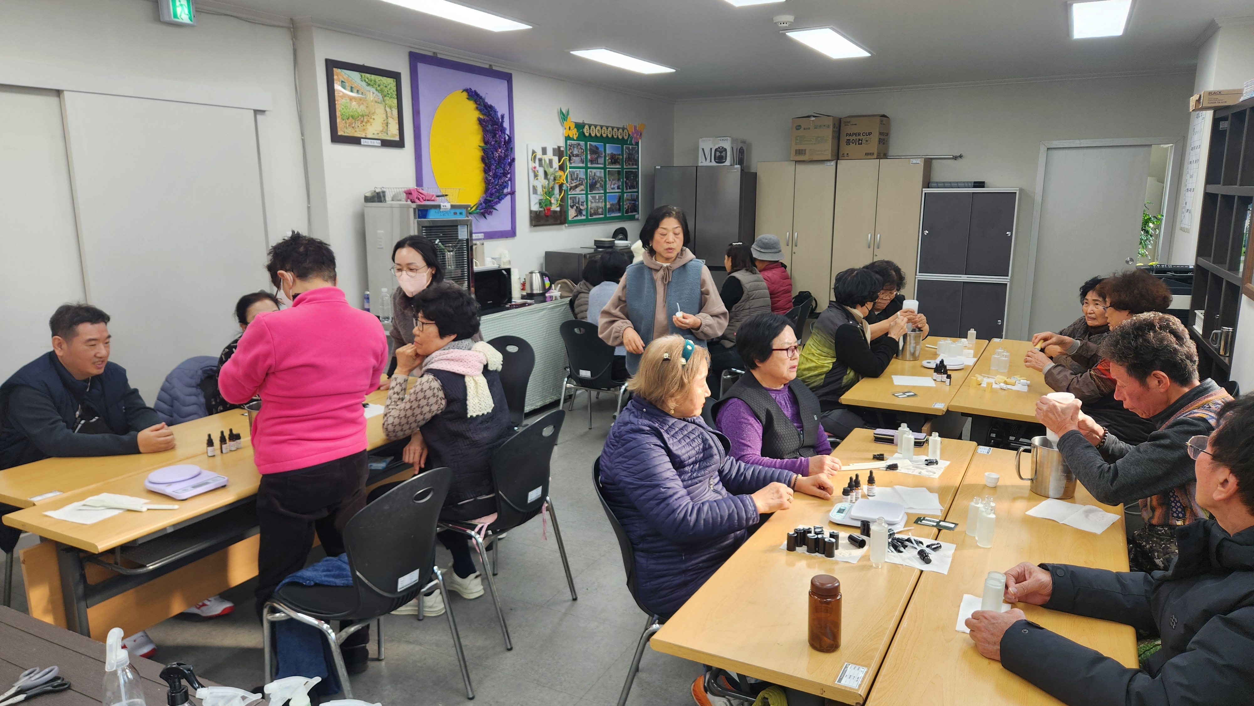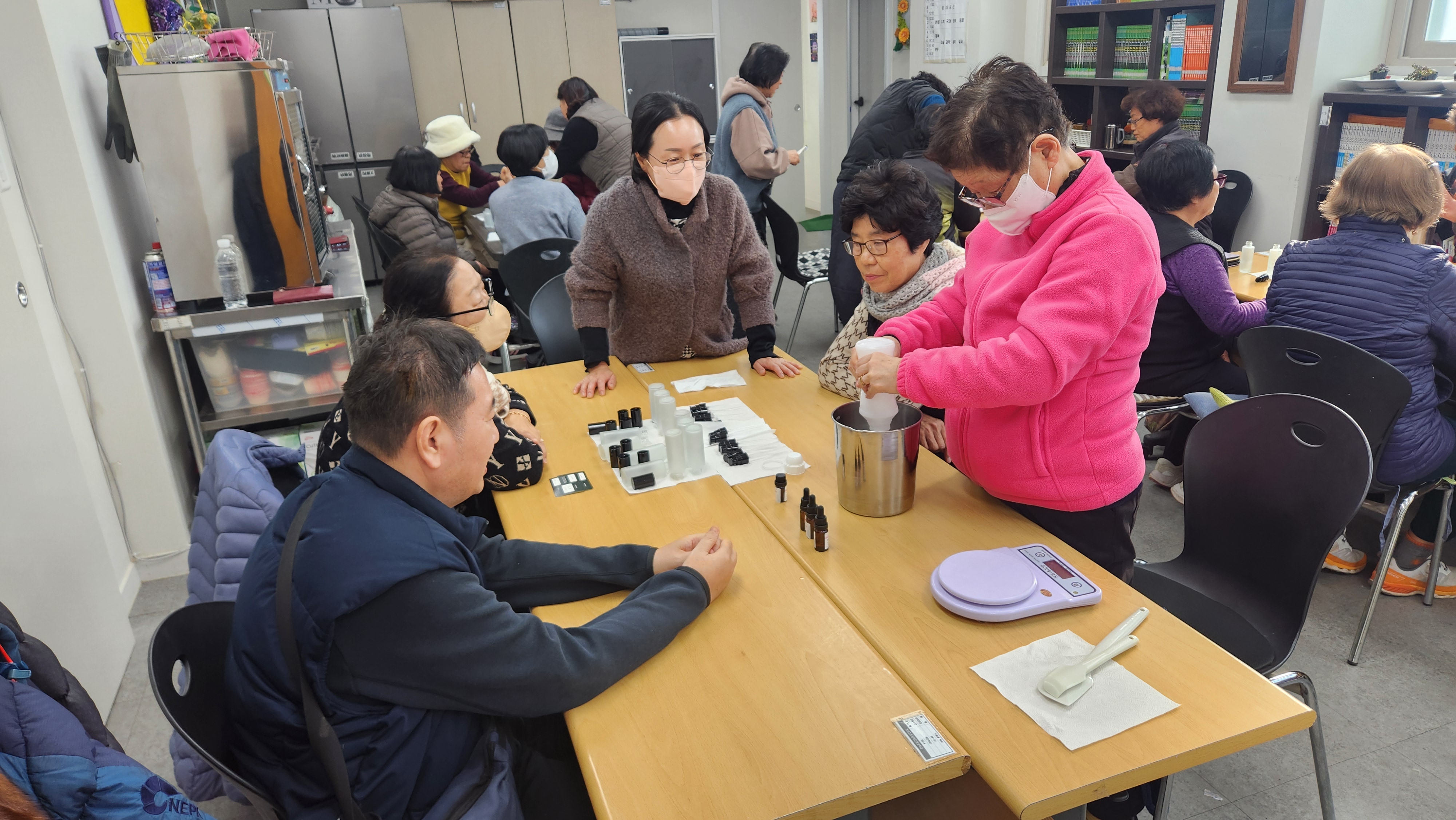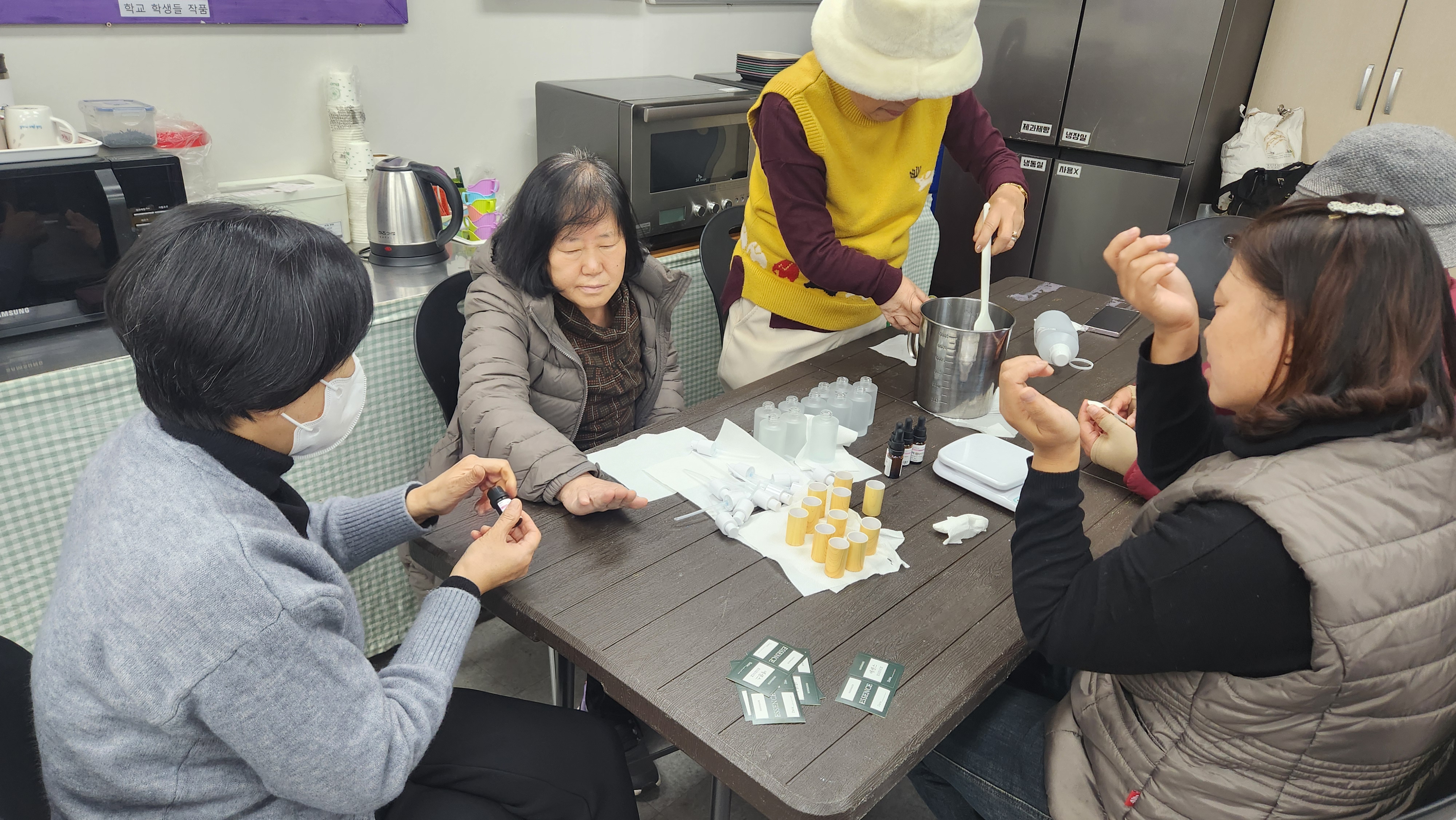 오늘 합반으로 진행한 프로그램은 토탈공예로 미백 에센스와 탄력로션을 만들어보았습니다. 보습펩타이드, 아세틸핵사펩타이드, EGF/FGF/IGF/ 에센셜 오일을 모두 섞어서 용기에 계량하여 섞어서 담아주었습니다. 겨울철 피부관리 잘하여 건조하지 않고 부드럽게 피부를 관리해보도록 합시다.