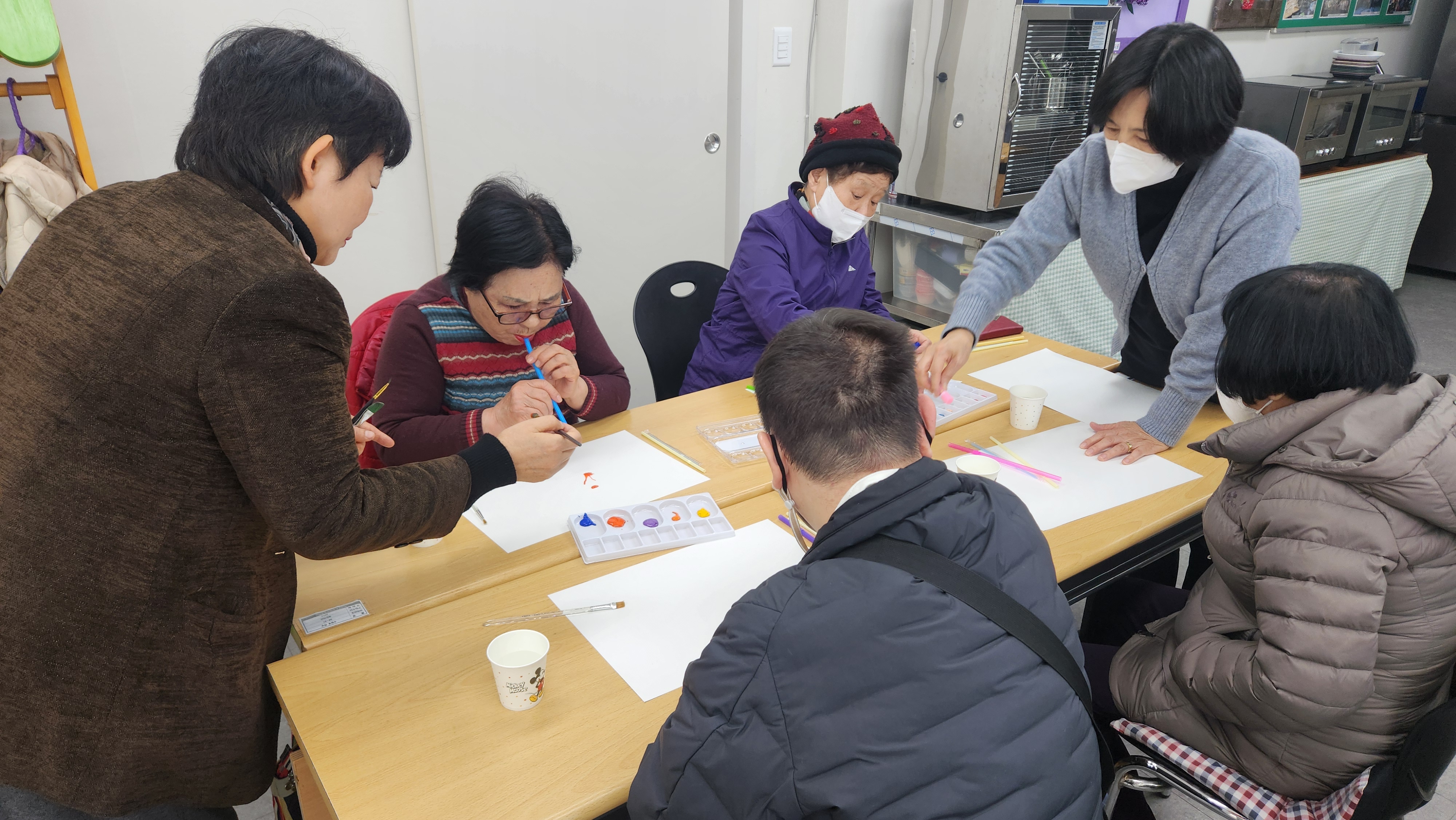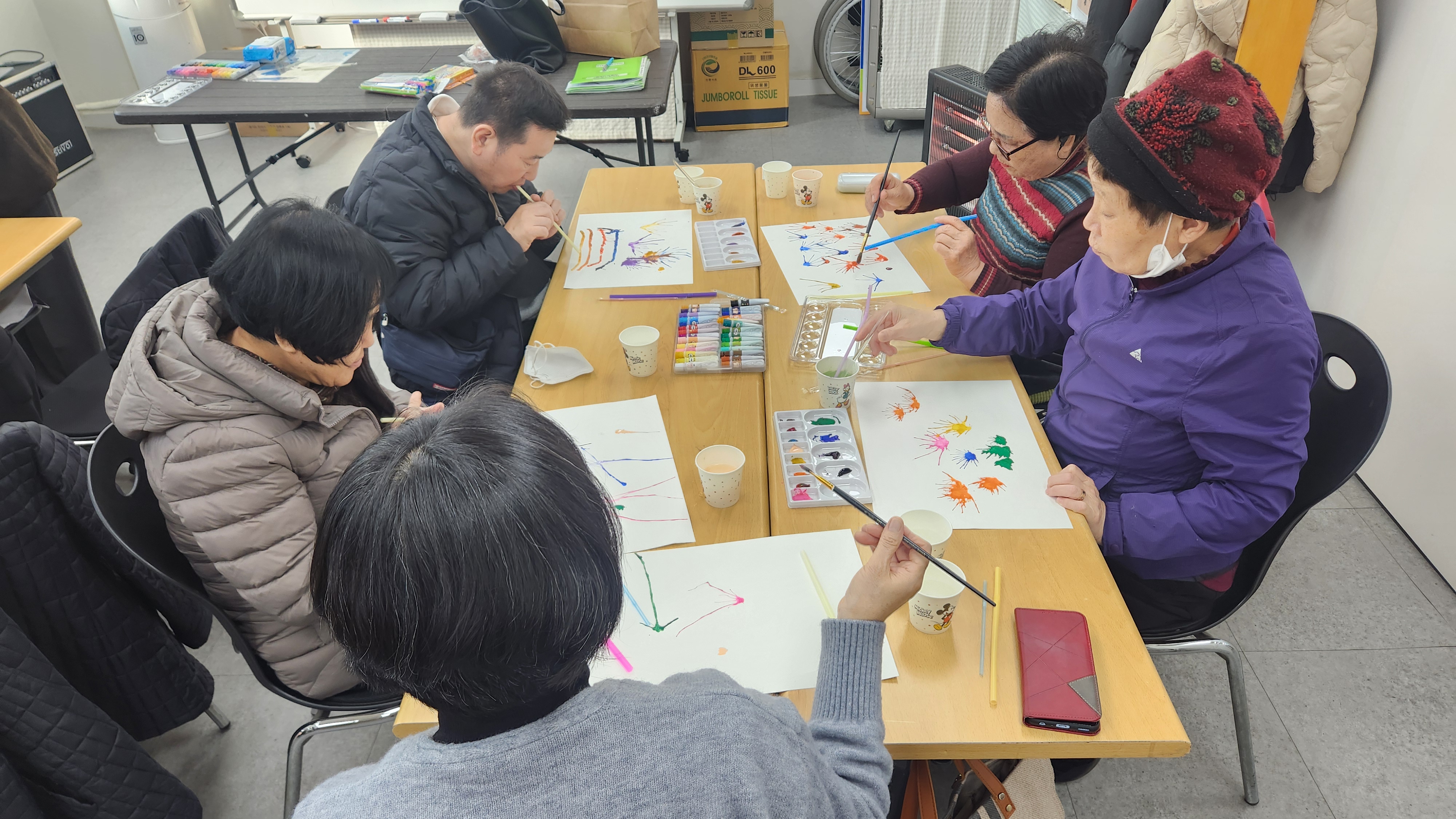 오늘 2반과 함께 한 프로그램은 미술심리치료로 부정적 감정을 표출해보는 시간을 가져보았습니다. 물감에 물을 흥건히 묻힌 후 도화지에 뿌려보고 빨대로 후후 불면서 내 안에 부정적인 감정을 밖으로 내보내보고 표출해보는 시간을 가져보았습니다. 모두들 스트레스 날려버리고 좋은 마음만 가득하길 바랍니다.