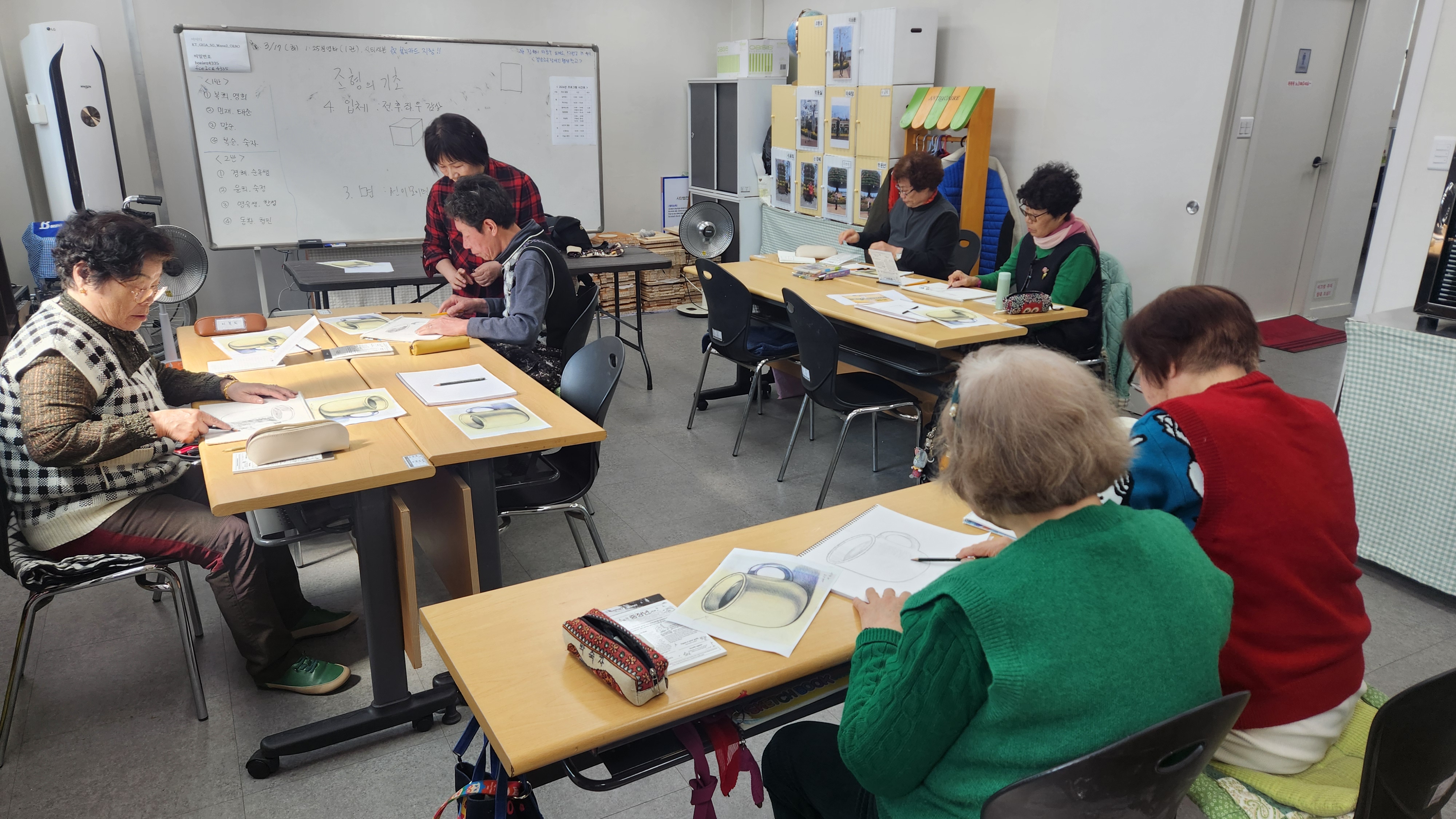 오늘 2반과 함께 한 프로그램은 미술스케치로 미술의 기초부터 배워봅니다. 먼저 조형의 요소를 이해해보기로 합니다. 우리가 흔히 알고 있는 "점"은 모든 모양을 이루는 기초입니다. 이 점들이 모여 선이 되고, 선이 모여 면을 이루며, 면이 모여 입체가 만들어짐을 배워보았습니다. 오늘은 손 근육을 강화시키기 위한 선 긋기 연습을 해보았으며 컵을 명암을 넣어 연필로 스케치해보는 시간을 가져보았습니다. 먼저 컵 뒷면에 먹지를 만들고 선을 따라 그려 본을 뜬 후 연하게 살살 명암을 넣어주고 어두운부분은 진하게 밝은 부분은 연하게 표현함으로써 입체감있는 컵을 완성시켜봅니다. 간단해 보이는 작업이지만 섬세한 작업인 만큼 조은학생들 열정적이고 진지하게 스케치해보는 모습입니다. 조금씩 완성되어가는 자신의 그림을 보며 만족감을 느끼고 빨리 완성시키고 싶어하는 마음을 보입니다. 완성시킨 학생들의 작품이 기대가 됩니다. 시간을 두고 천천히 작업해 나가도록 합시다. 오늘 모두들 수고많으셨습니다.