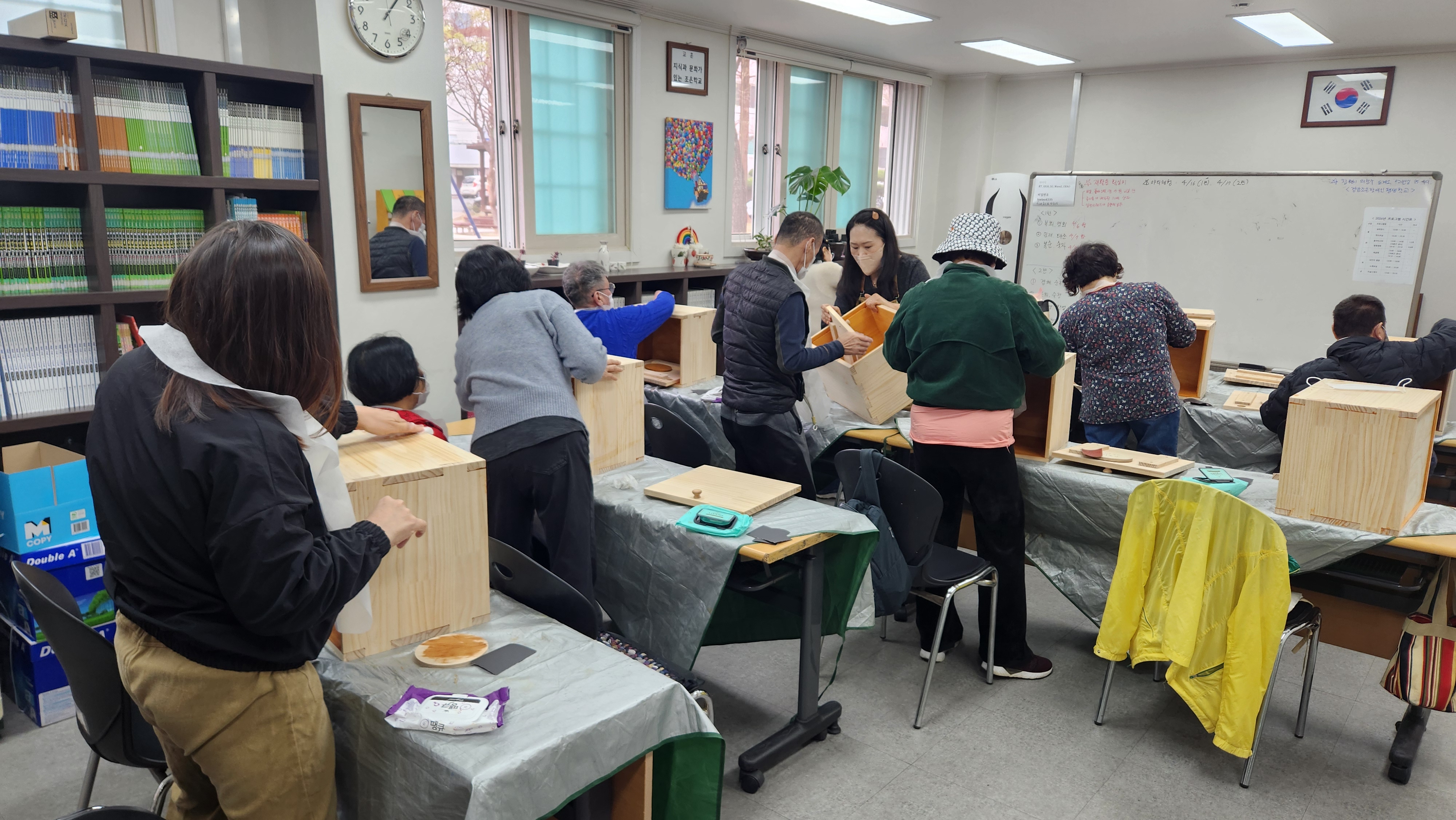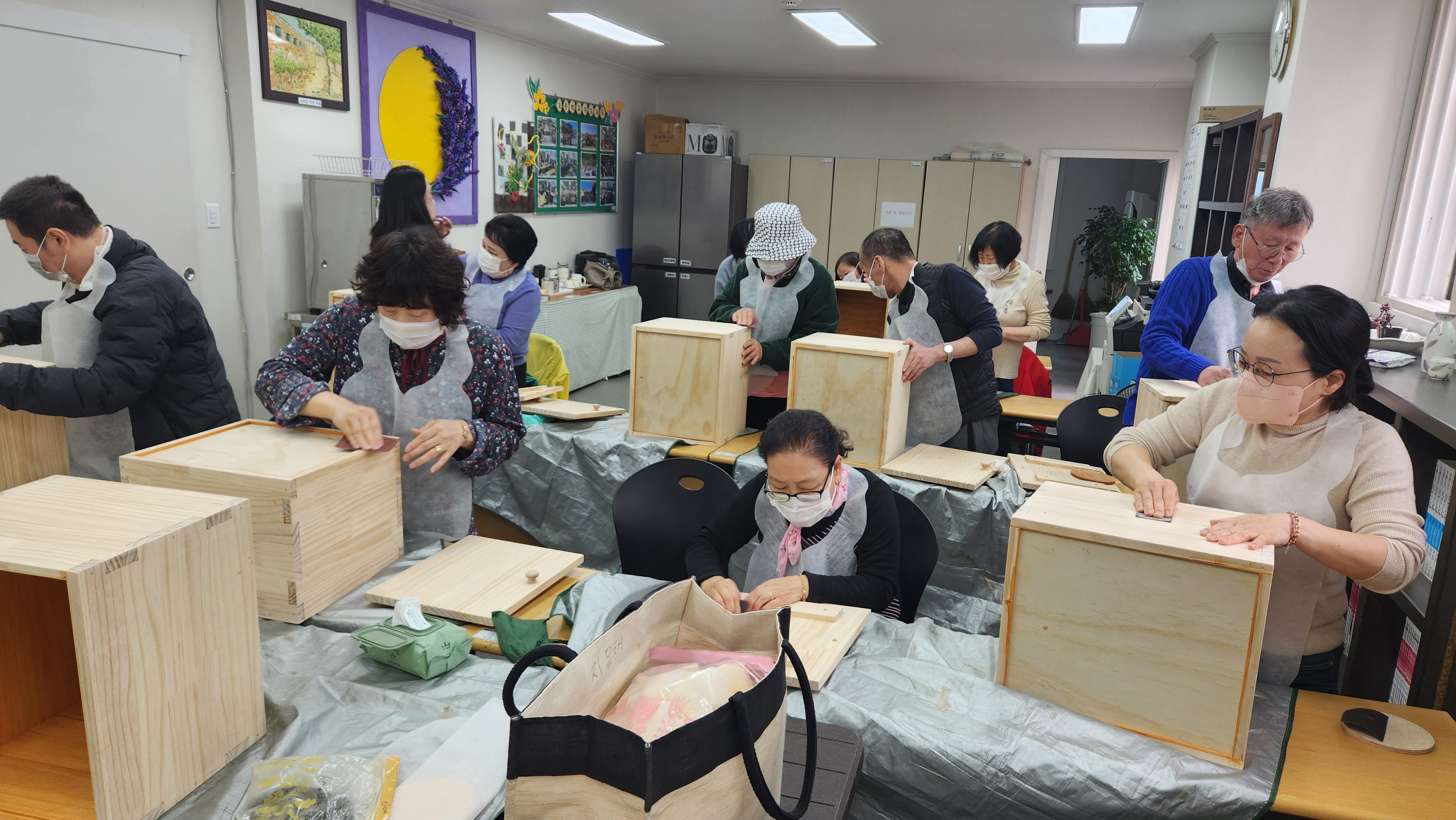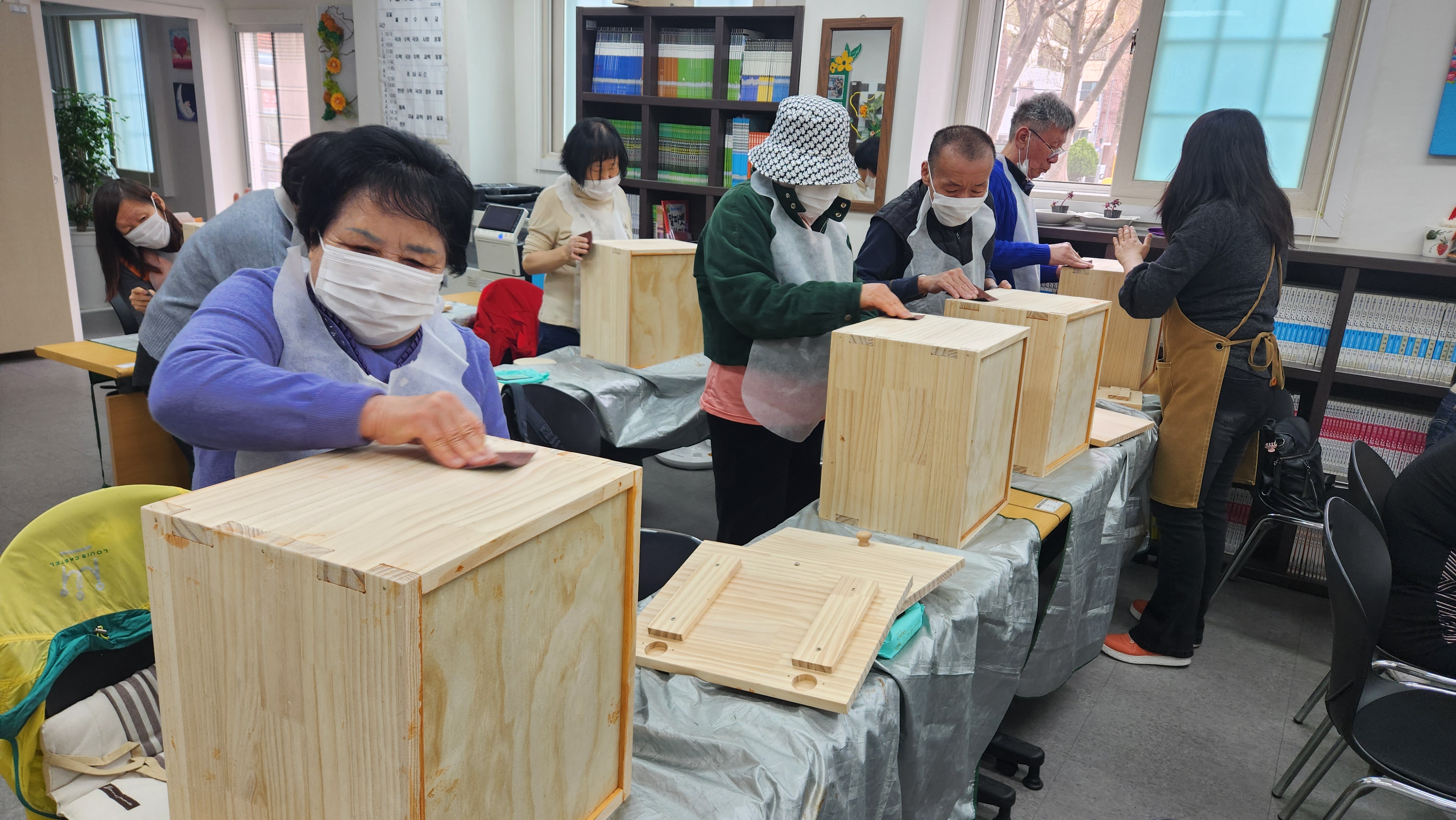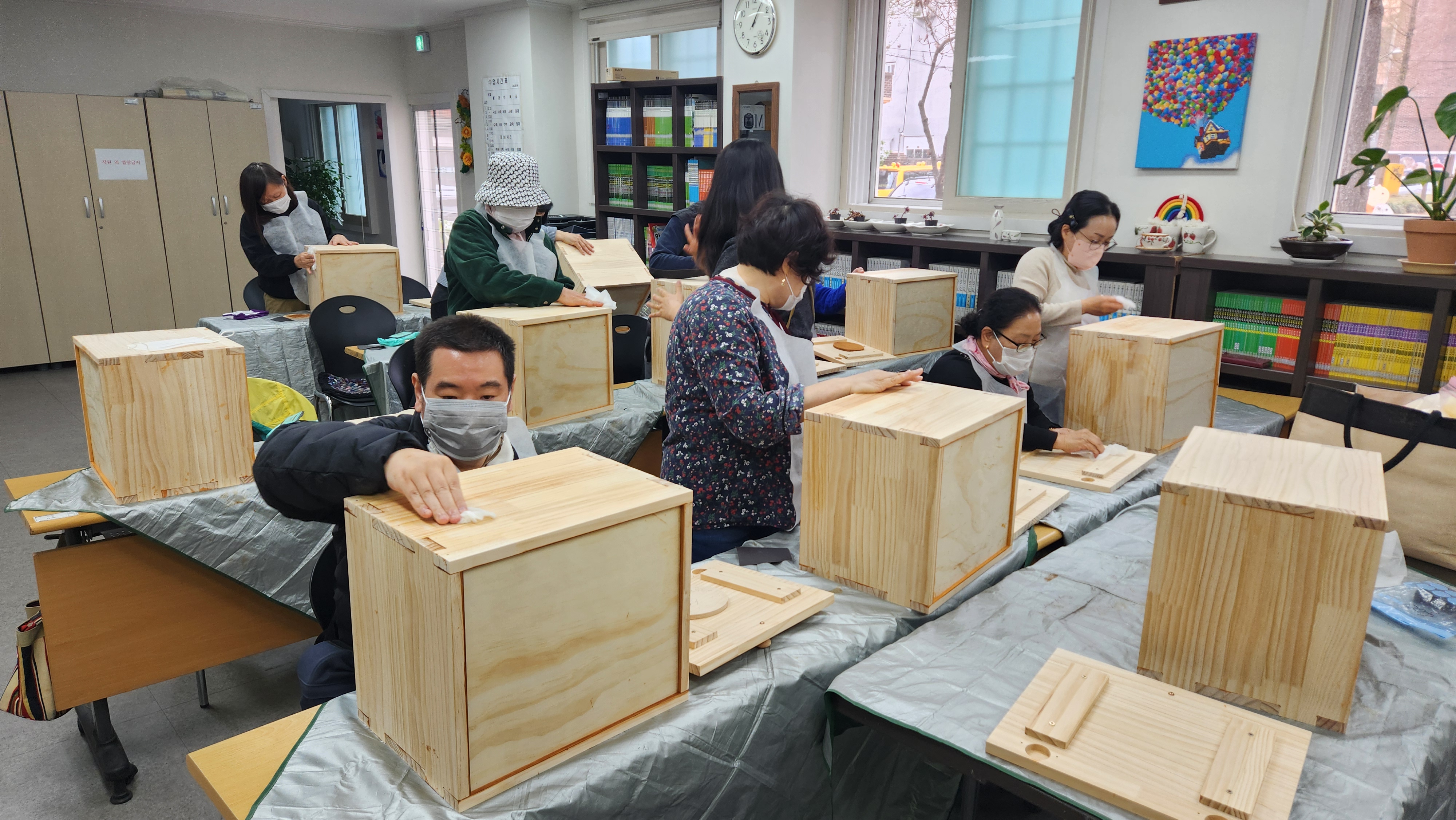 오늘 2반과 함께 한 프로그램은 목공예 수업으로 원목박스 만들기 3차수업을 진행해보았습니다. 먼저 원목박스 겉면에 물티슈로 물사포를 해줍니다. 그렇게 했더니 원목에 물기가 스며들어 거칠한 부분이 두드러지는걸 알수있었습니다. 물기를 잘 말려준 뒤 400방 사포로 먼저 샌딩작업을 해주었습니다. 사포질을 할때는 항상 나무의 결대로 길게 쭉쭉 사포질을 해주어야 좋은 결과가 나온다고 합니다. 열심히 400방 사포로 샌딩한 후 물티슈로 2차 물사포를 해주었습니다. 그런다음 이번에도 마찬가지고 건조를 시킨 후 600방 사포를 가지고 샌딩작업을 해보았습니다. 사포질을 열심히 할수록 겉면이 부드러워지는것을 알수 있었습니다. 사포질을 얼마나 잘하냐에 따라 스텐실을 발랐을때 표현되는 면이 다르다고 합니다. 열심히 사포질을 하여 원목박스를 최대한 부드럽게 해주기 위해 오늘도 조은학생들은 열심히 수업에 임해봅니다. 오늘 모두 수고하셨습니다.
