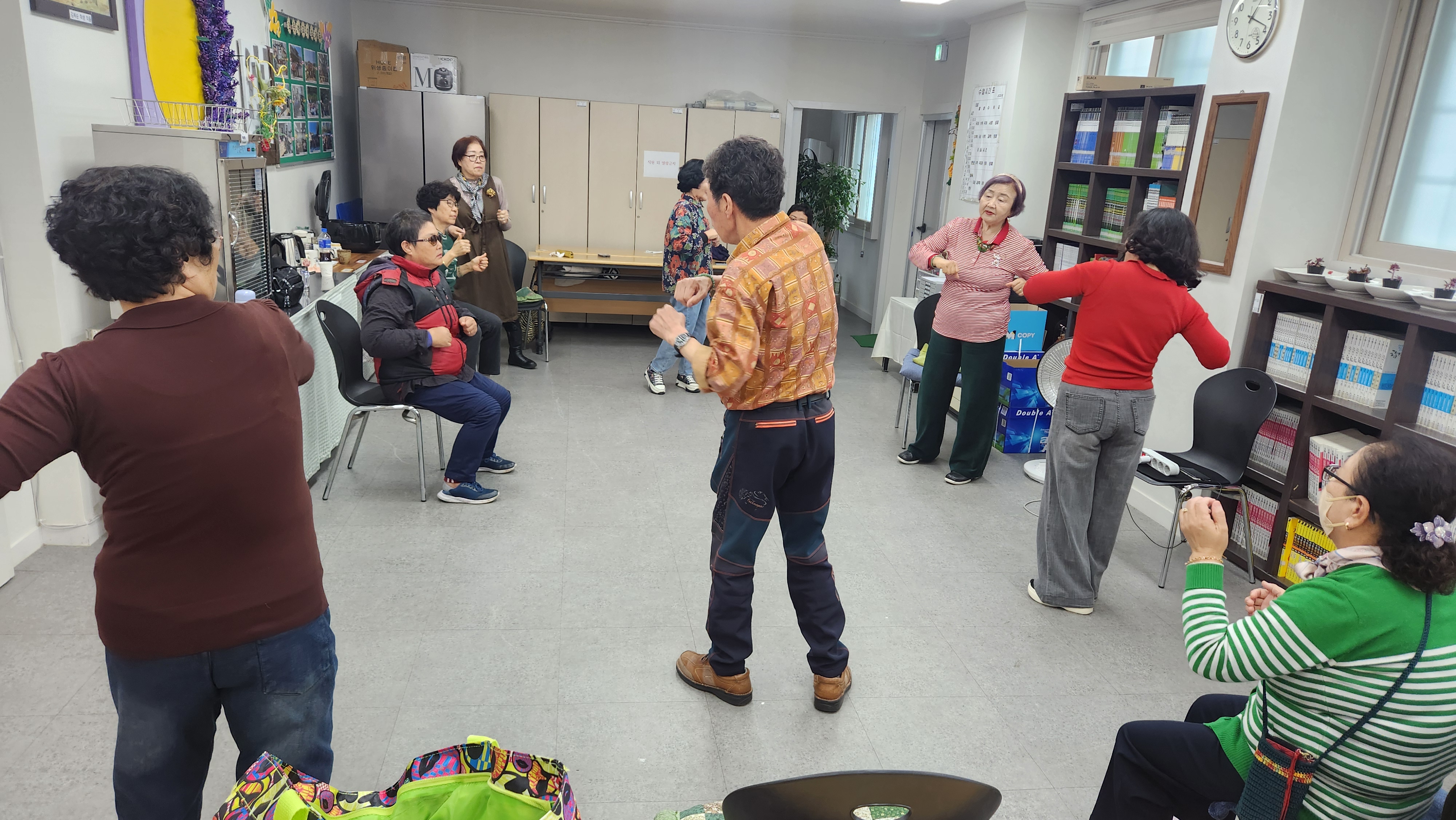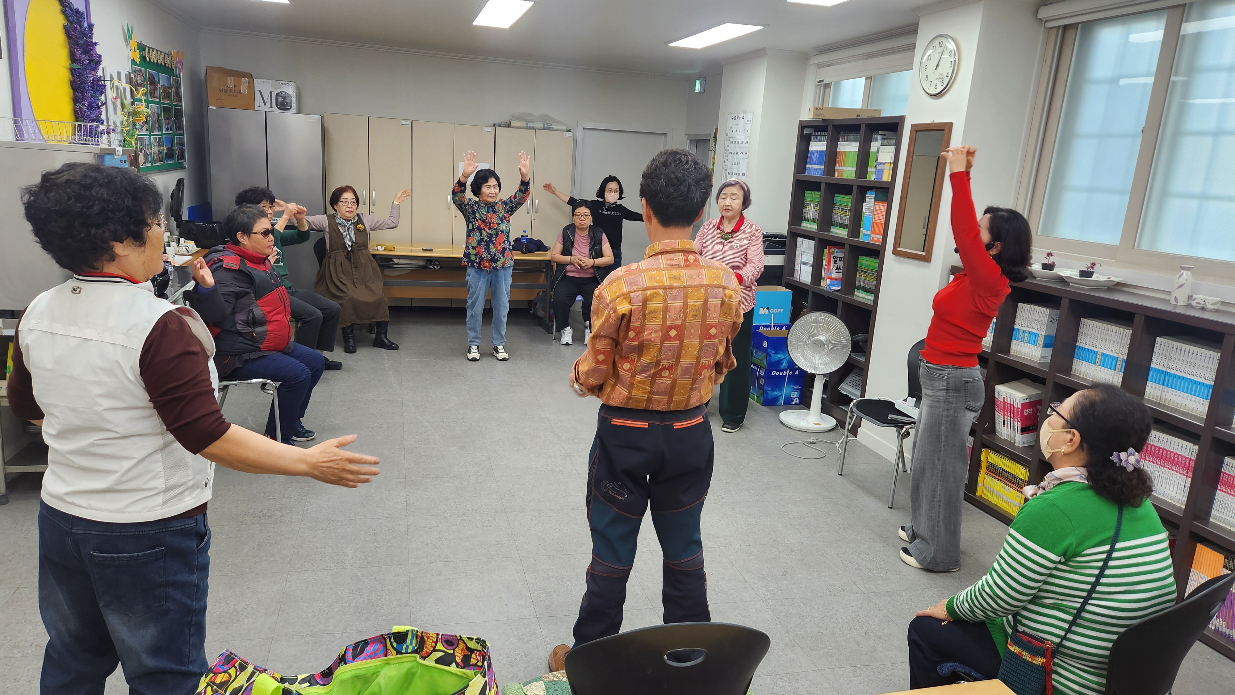 오늘 1반과 함께 한 프로그램은 실버댄스로 뇌건강체조와 손,주먹박수, 그리고 어꺠운동과 상하체 운동을 해보았습니다. "당신이 좋아" 노래에 맞춰 몸을 움직여 심신을 활기차게 해보았습니다. 그 다음 척추교정운동으로 자세를 주의깊게 관찰하며 바른교정 자세운동을 해보았으며 "고향버스" 노래에 맞춰 전신운동을 해보았습니다. 그 외 하체 강화운동을 다양한 방법으로 해보며 오늘 하루도 열심히 운동하는 시간을 가져봅니다. 음악과 함께 운동을 하니 시간이 너무 금방 흘러 학생들이 아쉬워하기로 합니다. 모두 수고많으셨습니다.
