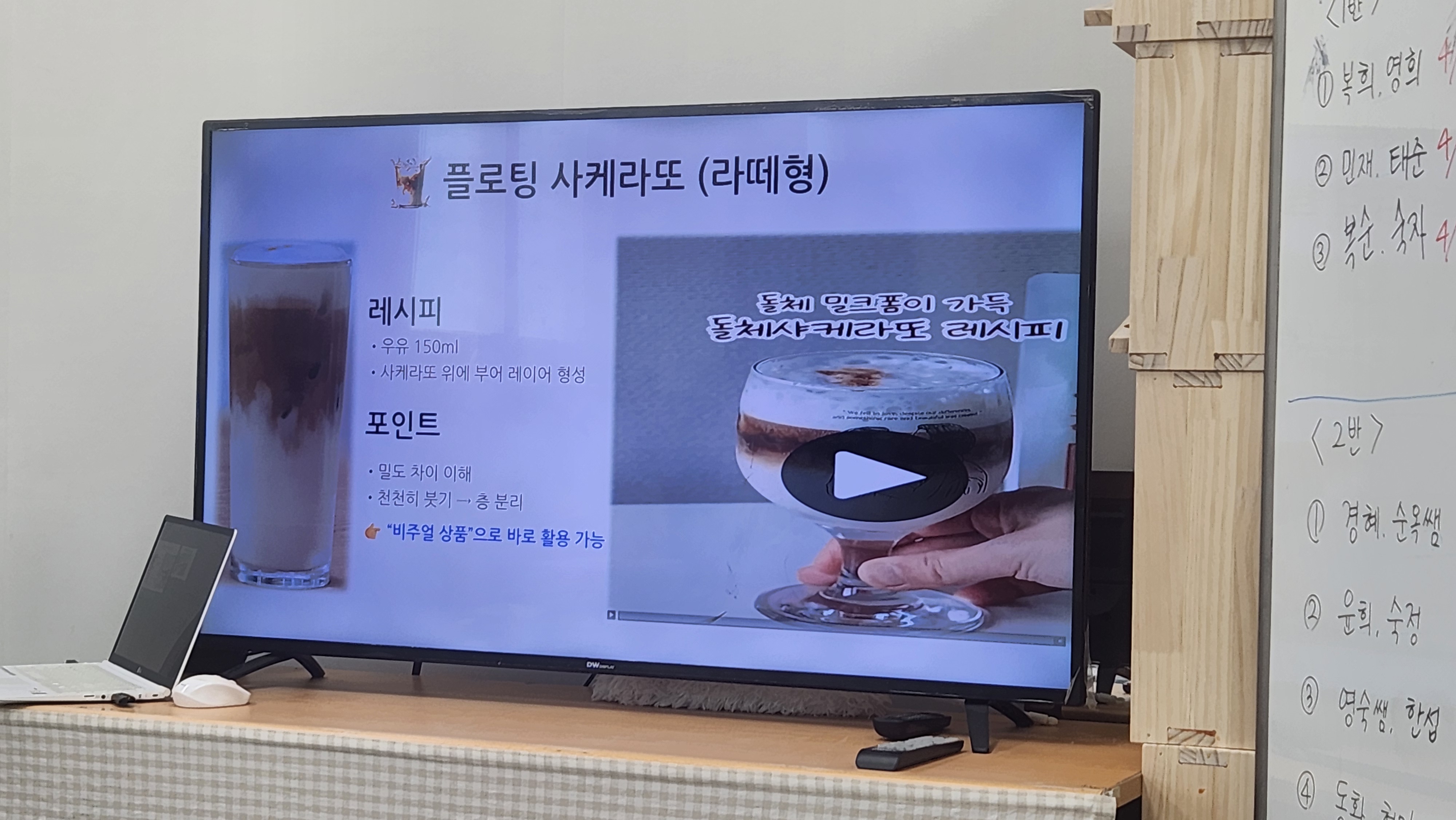 오늘 1반과 함께 한 프로그램은 홈바리스타로 사케라또를 만들어보는 시간을 가져보았습니다. 사케라또를 만들기 앞서 사케라또의 의미와 만드는 방법을 영상으로 확인해보았으며 사케라또의 종류인 베이직 사케라또와 돌체 사케라또에 대해 알아보았습니다. 사케라또를 만들기 위해 쉐이커를 사용해야 하며 30초간 열심히 흔들어 거품을 많이 만들수록 깊고 맛있는 사케라또가 만들어진다는 것을 확인할수 있었습니다. 팀별로 직접 베이직 사케라또와 돌체 사케라또는 만들어 맛보는 시간을 가져보았습니다. 학생들 모두 베이직 사케라또보다 돌체 사케라또를 더 선호함을 알수 있었습니다. 확실히 우유를 넣어 만든 돌체라떼가 더 부드러워 더 선호했던 것 같습니다. 재밌는 홈바리스타 시간이었습니다.