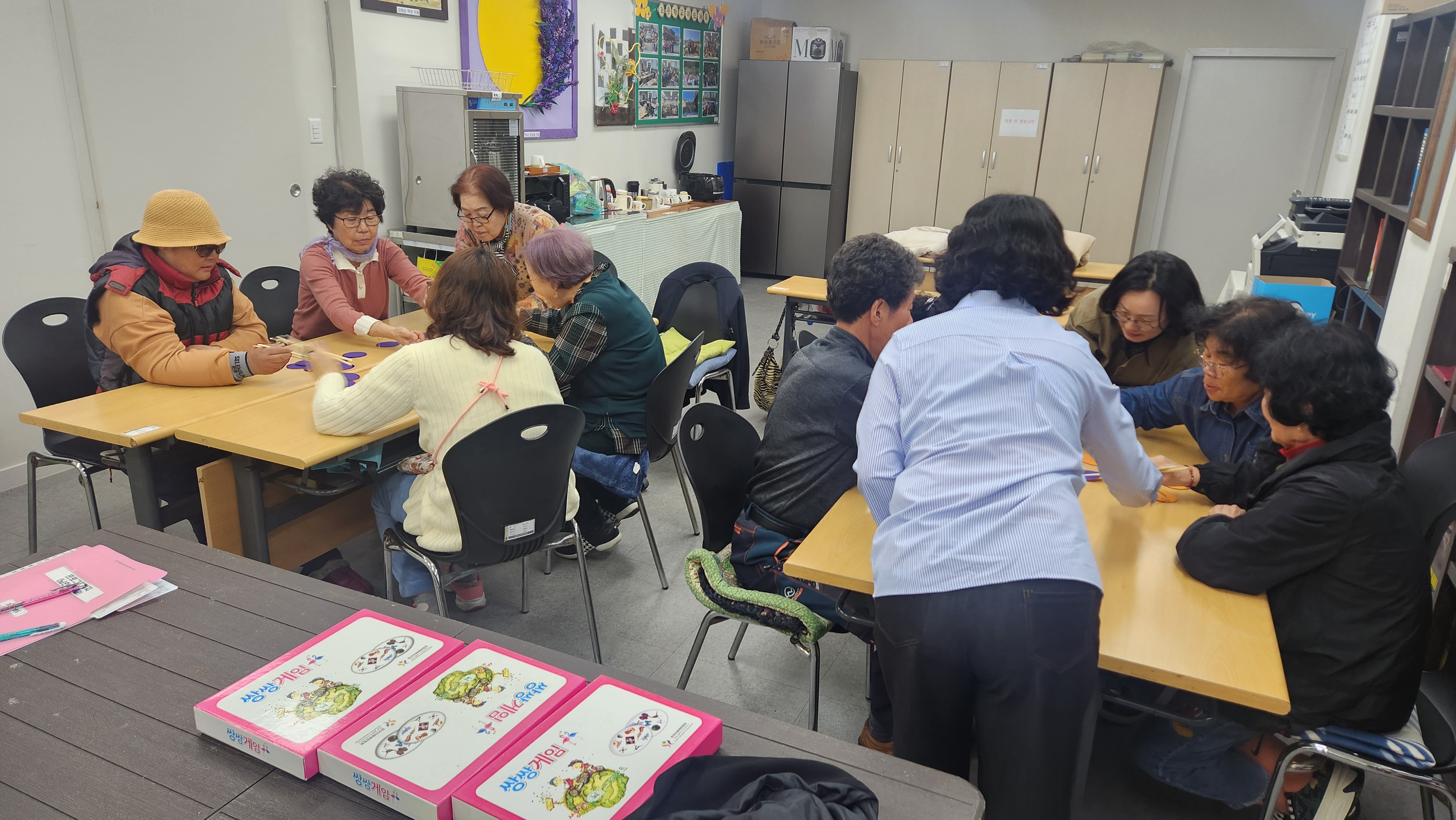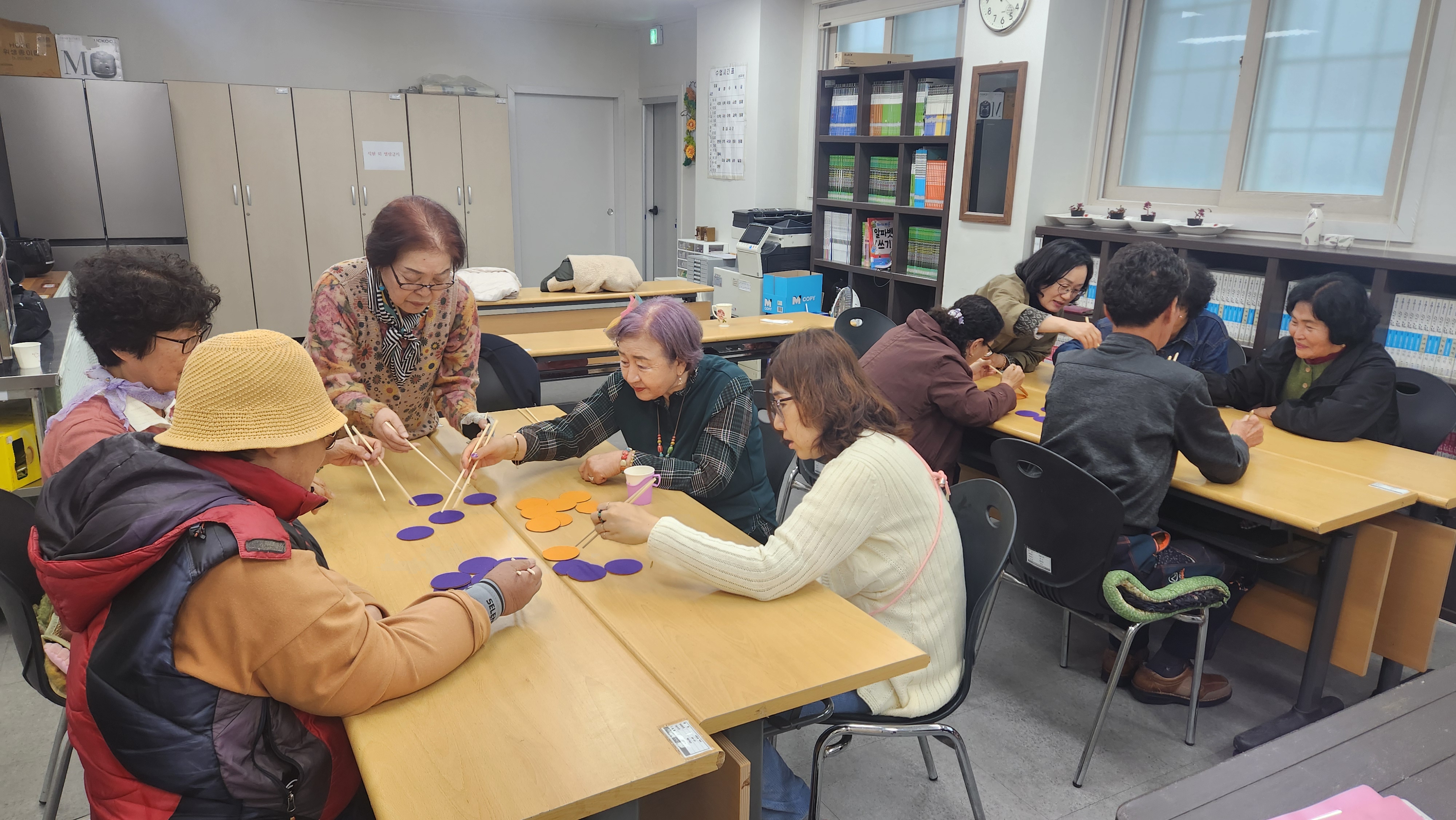 오늘 1반과 함께 한 프로그램은 뇌인지 발달로 쌍쌍게임을 진행해보았습니다. 카드 두장에 공통으로 들어가있는 그림을 찾아 "쌍쌍OO" 이라고 외치면서 게임을 진행해보았습니다. 모두들 처음에는 규칙이 입에 잘 맞지않아 바로 사물의 이름만 말해서 틀리는 경우가 많았는데 몇번 하다보니 쌍쌍OO 이 입에 붙어 서로 맞추려고 열심히 하는 모습이 너무 재밌어서 많이 웃었던 시간이었습니다. 그런 다음 편을 나누어 젓가락을 이용해 색호떡을 누가많이 뒤집느냐 하는 게임을 진행해보았습니다. 젓가락질이 잘되는 학생들은 얼마나 빠른 속도로 색호떡을 뒤집어버리는지 모두들 감탄하기도 하고 또 한편으로는 젓가락질이 안된다며 투덜대는 학생이 있어 하하호호 크게 웃기도 하는 시간을 가져보았습니다. 오늘의 뇌인지발달 게임을 통해 관찰력, 변별력, 집중력, 순발력, 사물인지, 단기기억을 높일수 있었던 시간이었습니다. 이러한 인지활동을 통해 신체활동에도 큰 도움을 줄수 있었던 시간이었습니다. 모두들 수고하셨습니다.